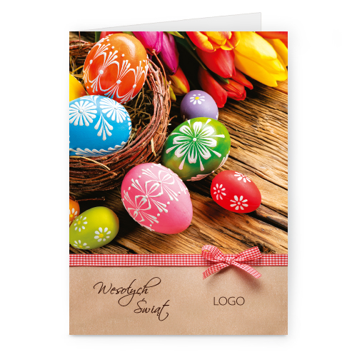 wzór: pion_43 SPECYFIKACJA: Logo i życzenia są drukowane bezpośrednio na kartce. Do każdej kartki dołączona jest biała koperta C6. Istnieje możliwość zmiany haseł na froncie na dowolnie podaną wersję językową. |